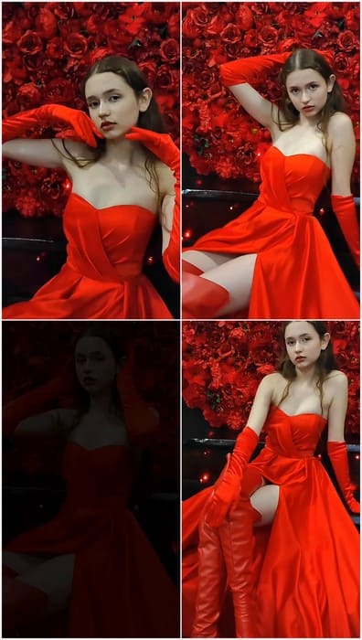 Dasha Gorbacheva leak video posing against roses in a strapless red gown, she radiates drama and beauty with long gloves and an intense stare.