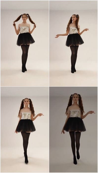 Dasha Gorbacheva model in a tutu-style skirt and sparkly top, Dasha channels playful glamour with tall boots, long legs, and youthful expression.