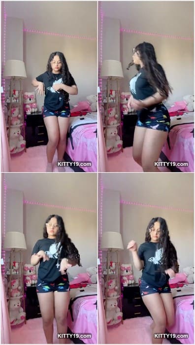 Stefrpp twerk performs fun dance moves in a playful bedroom, wearing a black t-shirt and colorful shorts, surrounded by plushies.